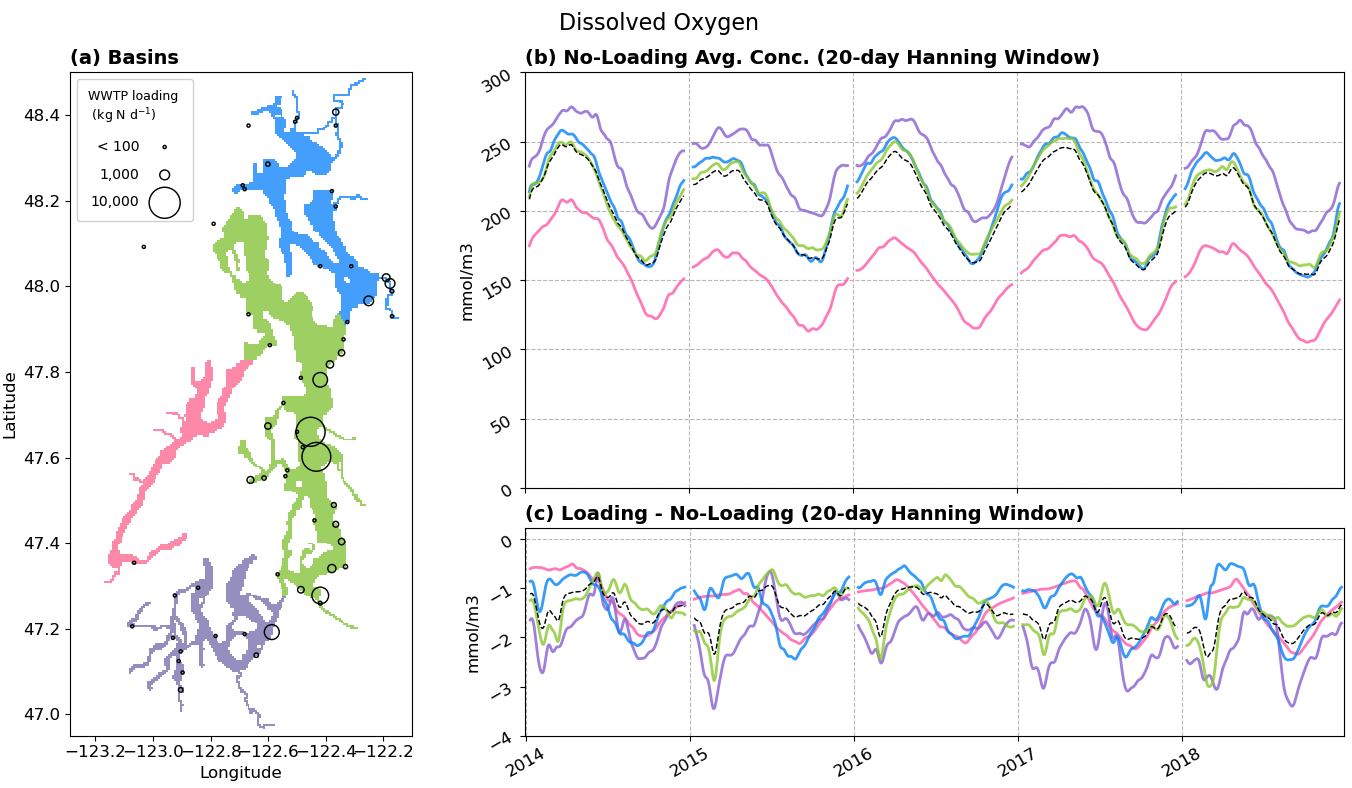 Fig 7. Average dissolved oxygen concentration in the different basins of Puget Sound. (a) Delineation of basin boundaries and location & discharge of WWTPs. (b) Average concentration in the no-loading run, partitioned by basin. The black dashed line represents the whole of Puget Sound. (c) Difference between the loading run and no-loading run average concentrations.