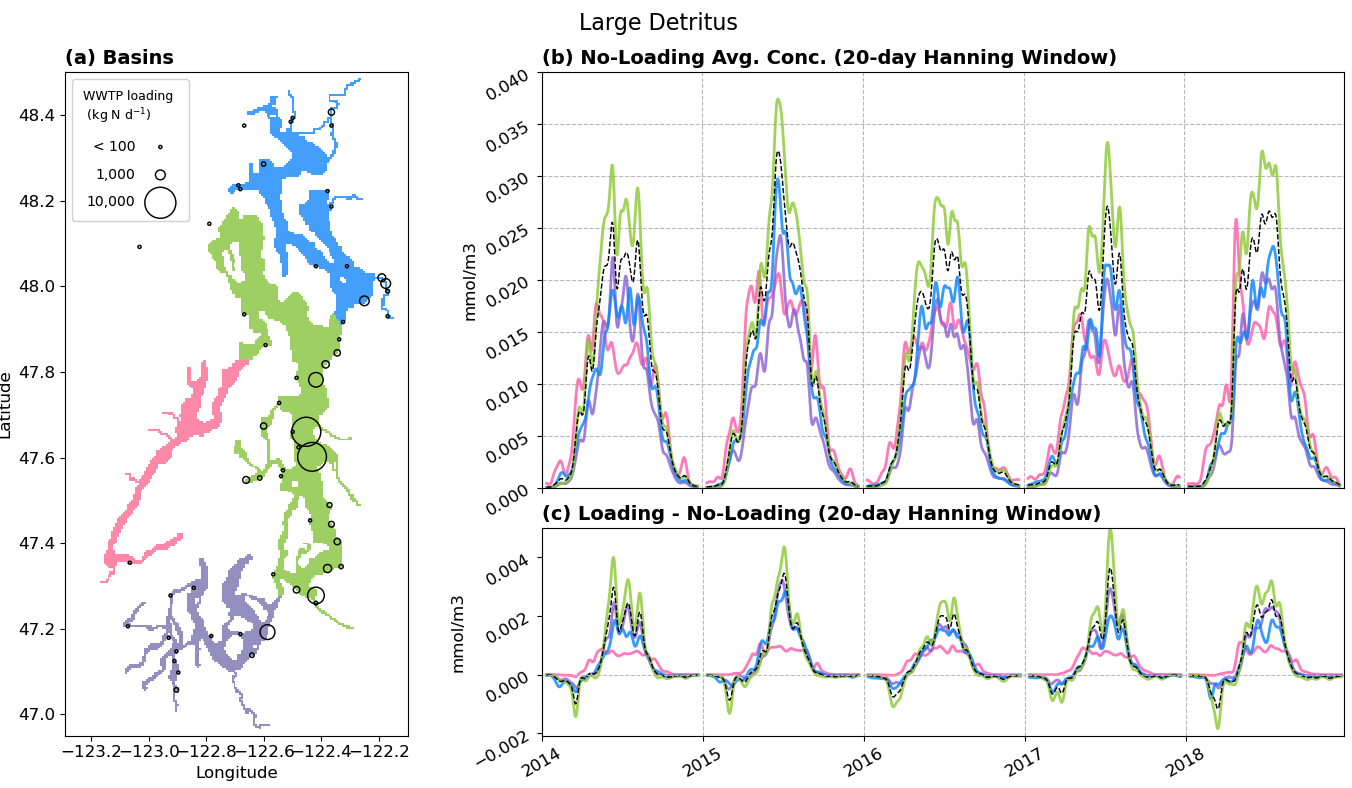 Fig 6. Average large detritus concentration in the different basins of Puget Sound. (a) Delineation of basin boundaries and location & discharge of WWTPs. (b) Average concentration in the no-loading run, partitioned by basin. The black dashed line represents the whole of Puget Sound. (c) Difference between the loading run and no-loading run average concentrations.