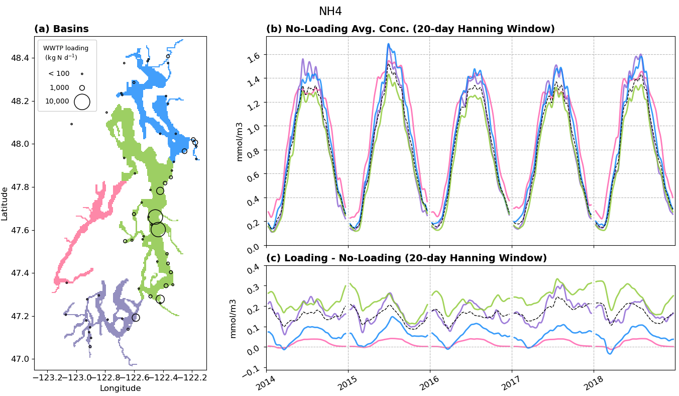 In the no-loading run, all basins have similar concentrations of NH4 with similar seasonal patterns (Figure 2b). Hood Canal’s seasonal variability has the smallest amplitude relative to the other basins.