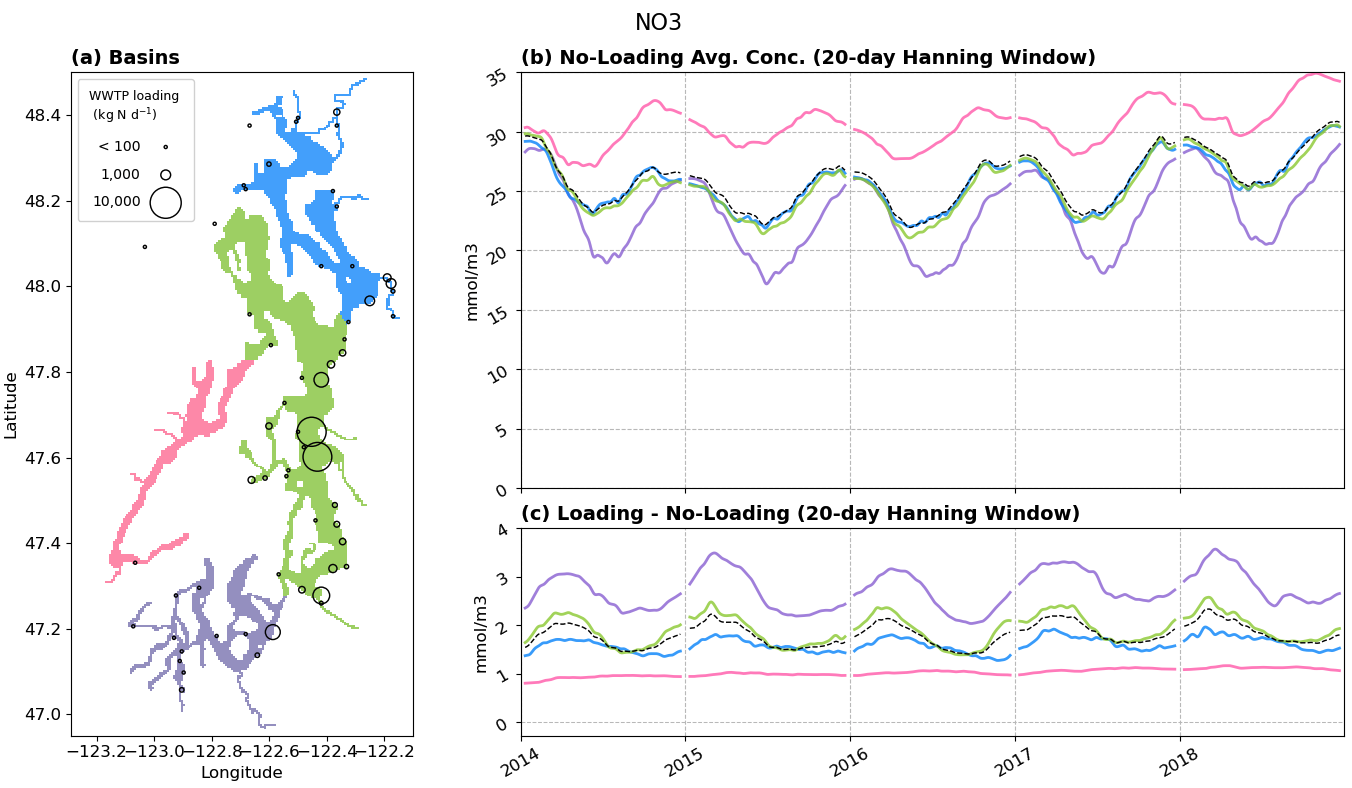 All of the figures in this blog post are formatted the same way. Let’s consider Figure 1 as our example. Panel a shows how I have partitioned Puget Sound into its distinct sub-basins. I have also added circles to indicate the locations and sizes of WWTPs discharging to the region. Panel b shows the average concentration of NO3 in the no-loading run in each basin. This was calculated by integrating the total amount of NO3 in each basin, then dividing by basin volume. Panel c shows the difference in the average NO3 concentration between the two runs. I subtracted the no-loading run from the loading run, so positive values indicate that the loading run has more NO3. Conversely, negative values indicate that the loading run has less NO3. I applied a 20-day Hanning Window filter to the time series in panels b and c.