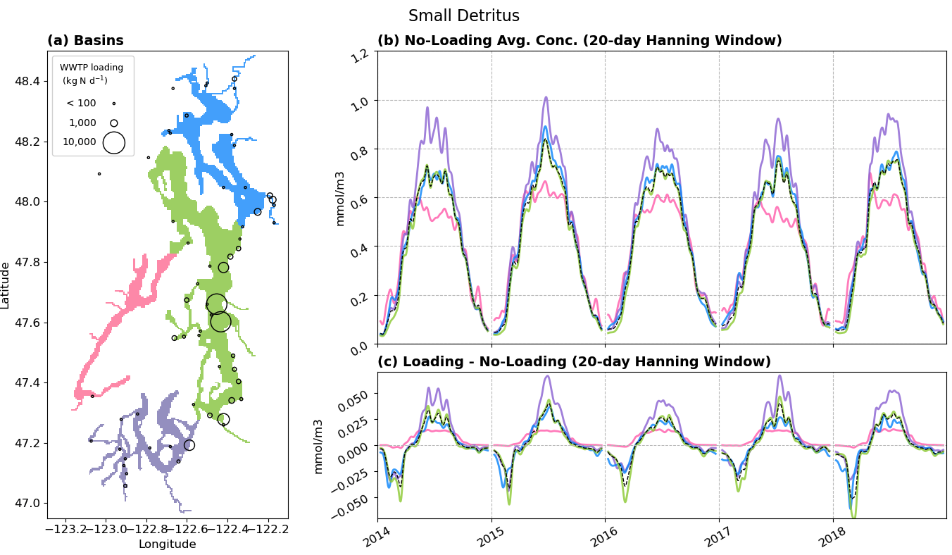 Fig 5. Average small detritus concentration in the different basins of Puget Sound. (a) Delineation of basin boundaries and location & discharge of WWTPs. (b) Average concentration in the no-loading run, partitioned by basin. The black dashed line represents the whole of Puget Sound. (c) Difference between the loading run and no-loading run average concentrations.