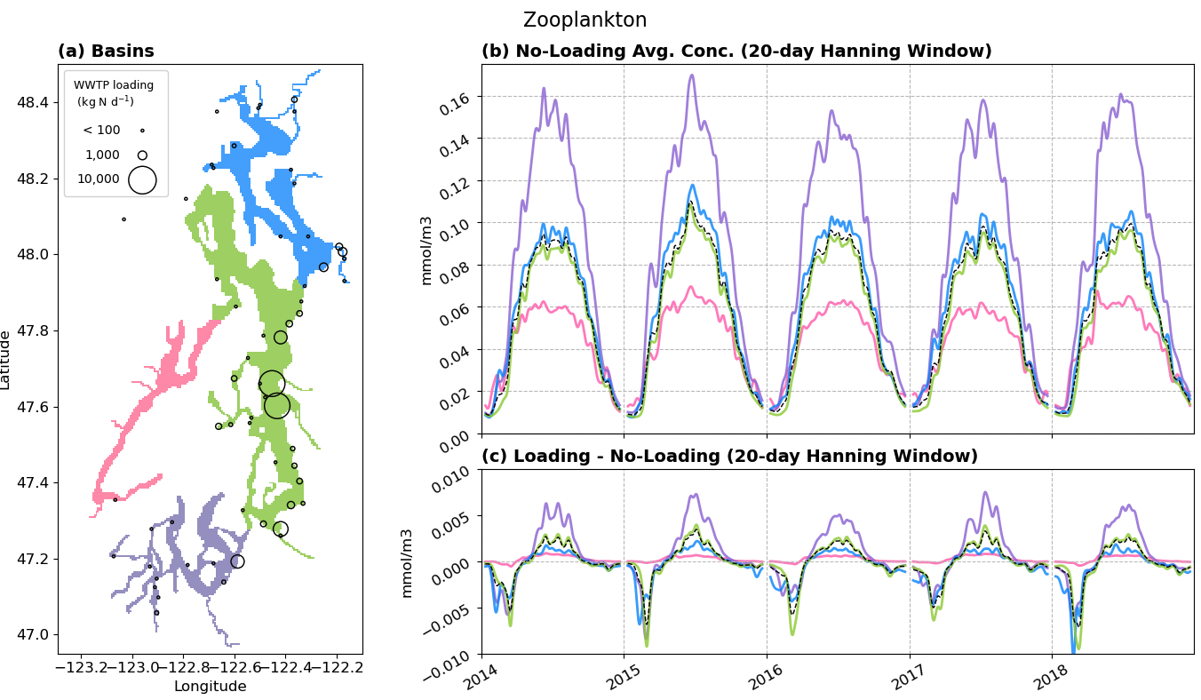 Fig 4. Average zooplankton concentration in the different basins of Puget Sound. (a) Delineation of basin boundaries and location & discharge of WWTPs. (b) Average concentration in the no-loading run, partitioned by basin. The black dashed line represents the whole of Puget Sound. (c) Difference between the loading run and no-loading run average concentrations.